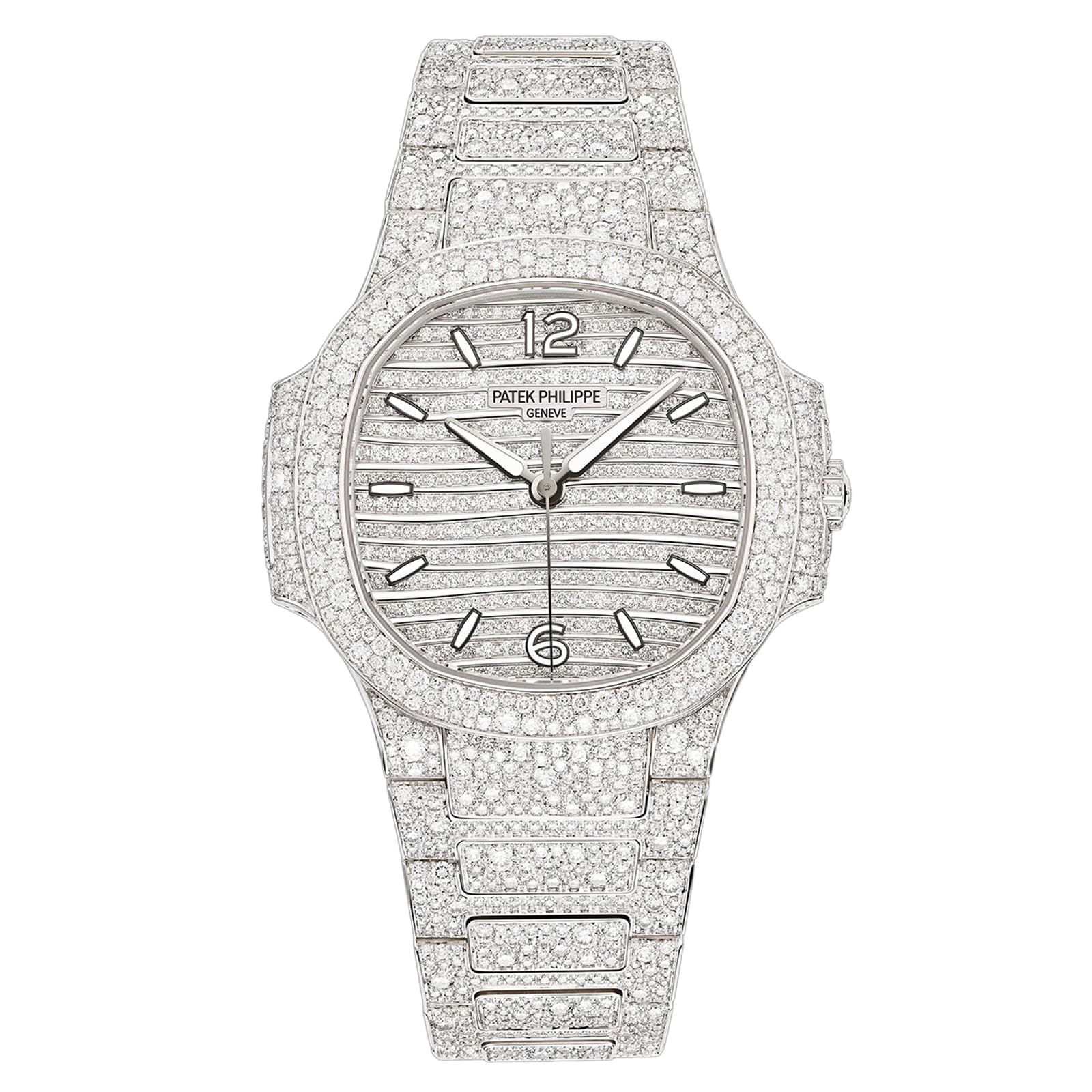 Patek Philippe combines the iconic Nautilus design with the refined touch of Haute Joaillerie in a white gold model on which the case, bezel and bracelet are adorned with snow-set diamonds. The dial is lit up by rows of gems following the dainty wave pattern typical of the Ladies’ Nautilus collection. Beating at the heart of this horological treasure is a mechanical self-winding movement.